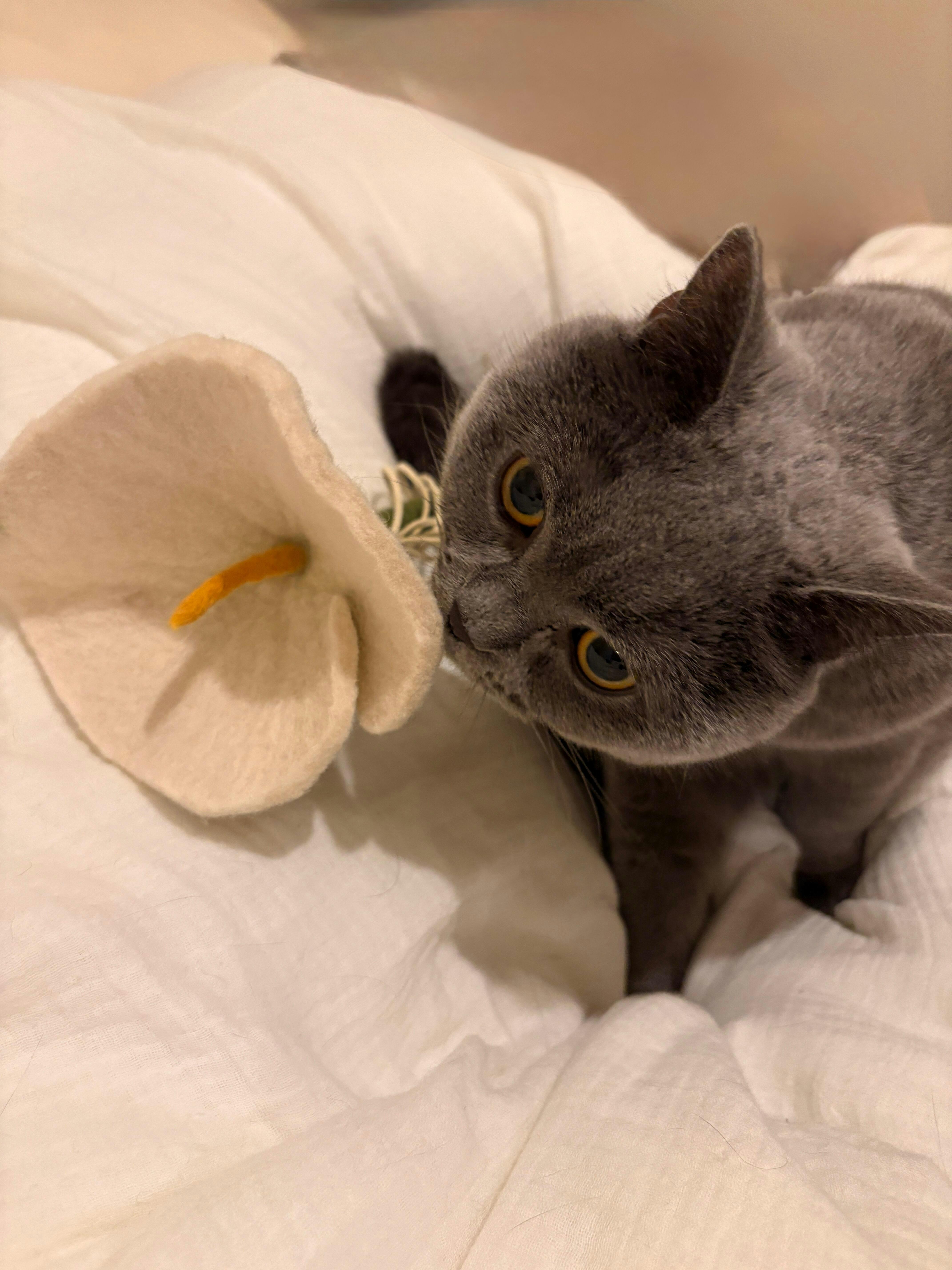 古代ギリシャでは、美の象徴として愛されたカラーリリー。その優美な姿をモチーフに、リボンのような仕上げでデザインしました。ひとつひとつがネパールの職人によるハンドクラフト。天然のウールとスエードのみを用いた、猫にやさしい素材です。